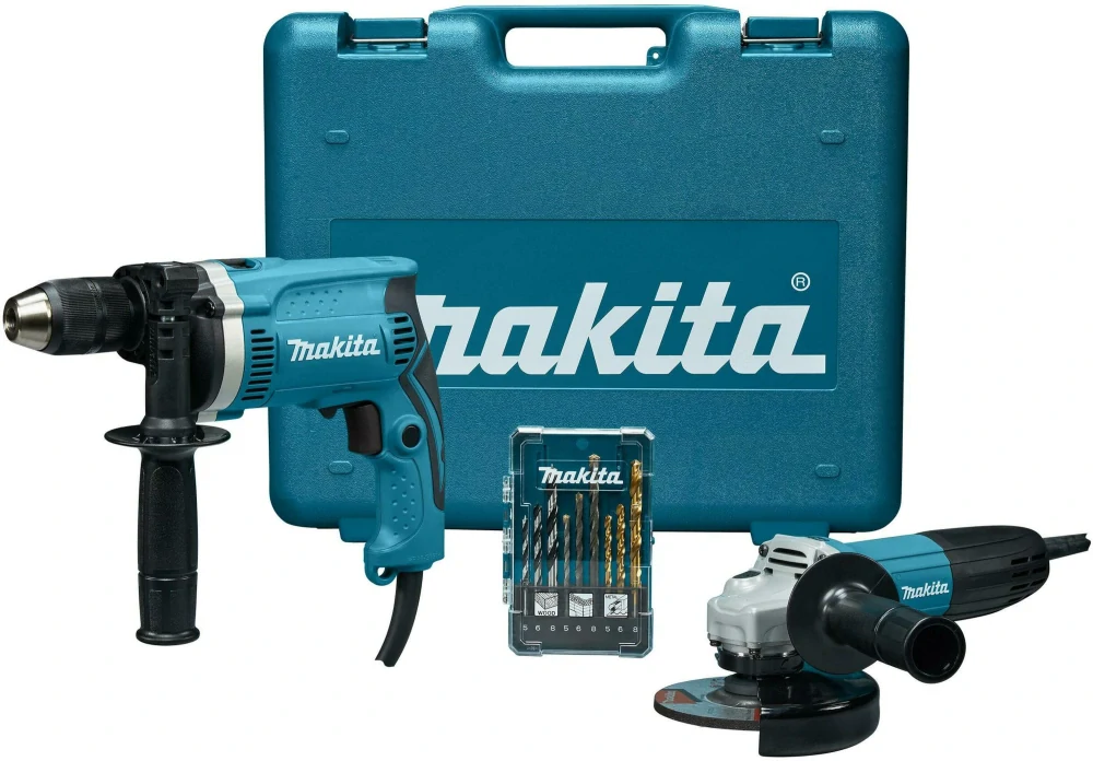 Sada obsahuje: uhlovú brúsku GA5030R + príklepovú vŕtačku HP1631 + sadu vrtákov